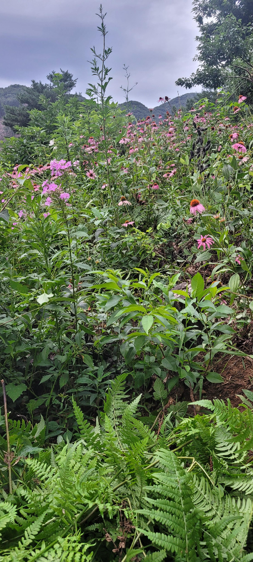 비탈 정원 꽃들이 햇볕보기 전쟁을 한다.