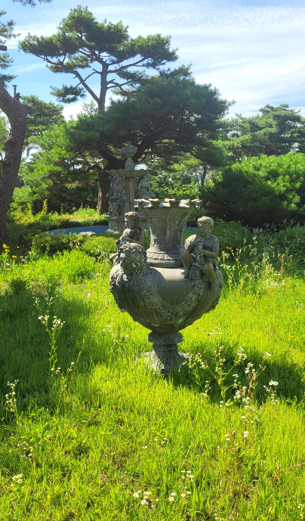 조각상들이 있는 정원에 망초꽃이 피었다.
