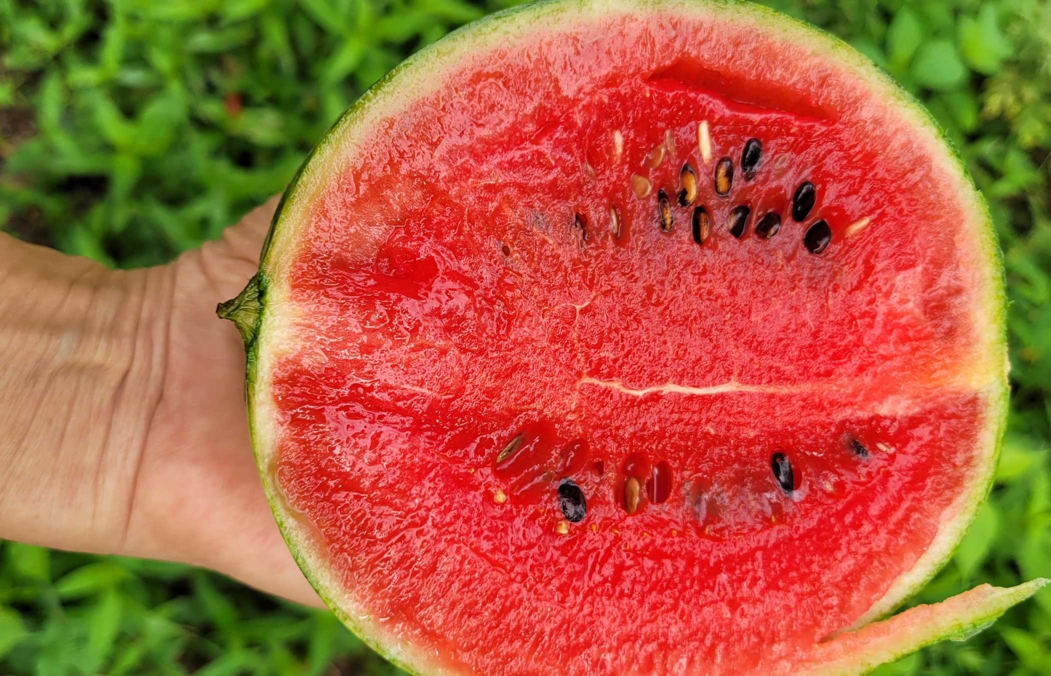 14일 가뭄에 갈라터진 복수박도 있고 . 세 뼘 둘레로 큰 복수박을 잘랐는데 안 익었다.